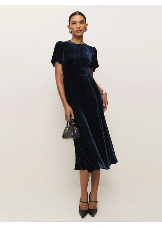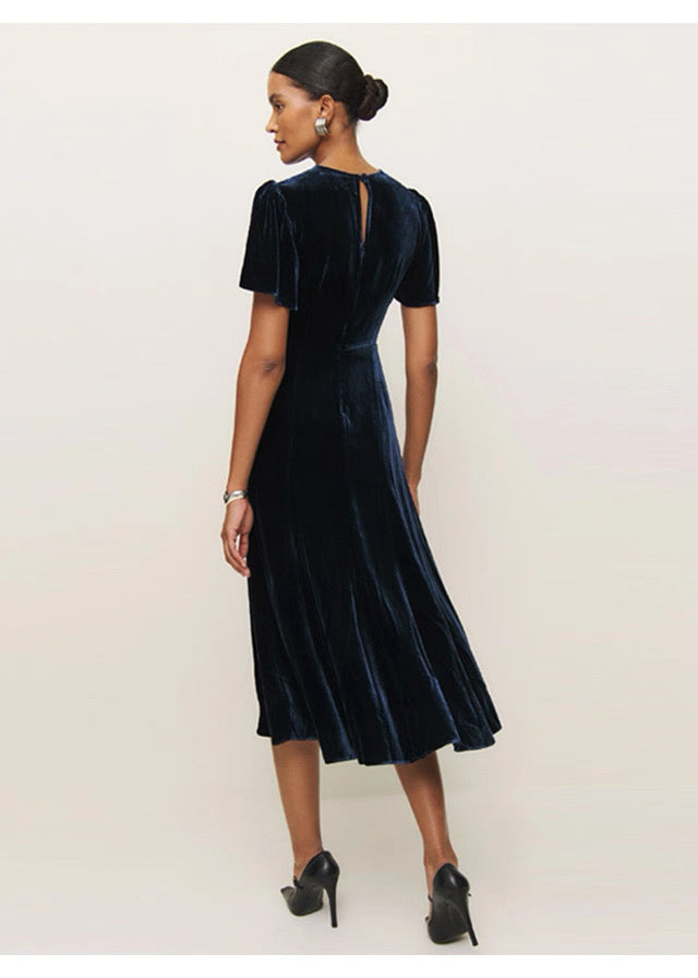 Navy Blue Velvet Short Sleeve Midi Dress
